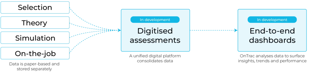 - A connected end-to-end training dashboard gives instructors, assessors and QA leads a single view of trainee performance across every stage of the journey.