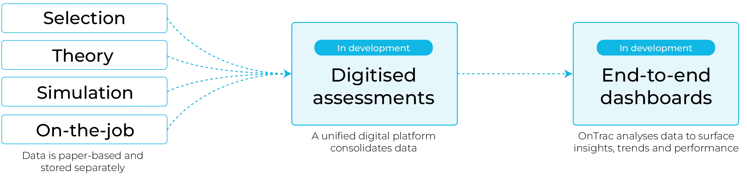 - A connected end-to-end training dashboard gives instructors, assessors and QA leads a single view of trainee performance across every stage of the journey.